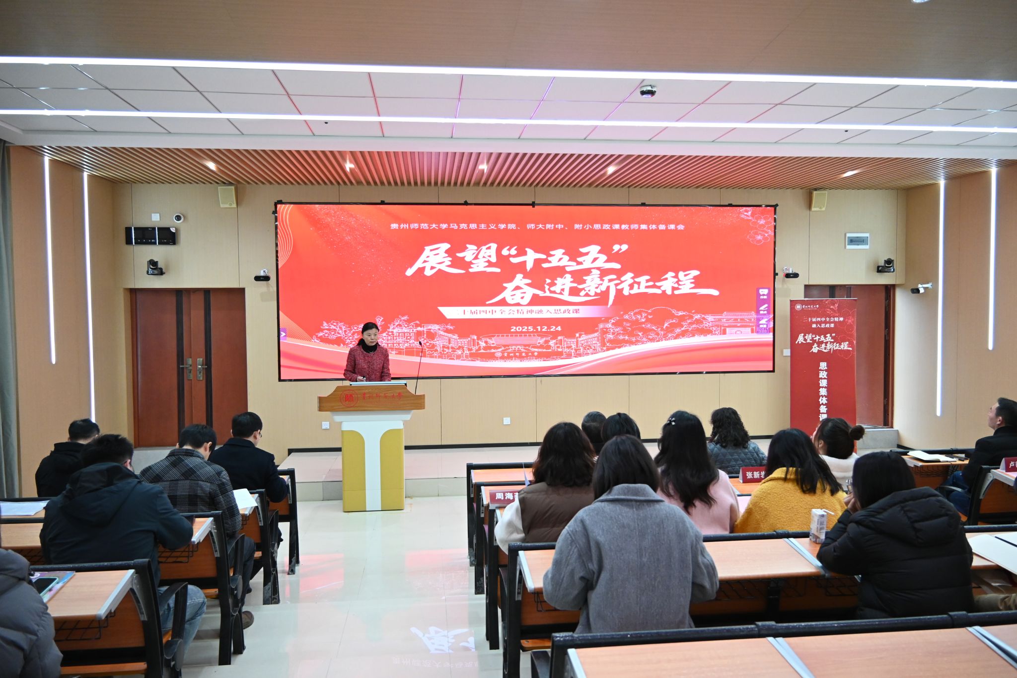 12月24日,贵州师范大学马克思主义学院联合附属高中、贵安新区附属初中、贵安新区附属小学在学校东区GJ4101 教室举行以“展望‘十五五’ 奋进新征程”为主题的大中小学思政课教师集体备课会。备课会围绕“经济建设、政治建设、文化建设、社会建设、生态文明建设”五位一体总体布局,将党的二十届四中全会精神融入大中小学思政课教学。校党委书记黄其松,校党委副书记路言莉,副校长管新福,校党委常委、统战部部长、马克思主义学院党委书记路世传出席。...