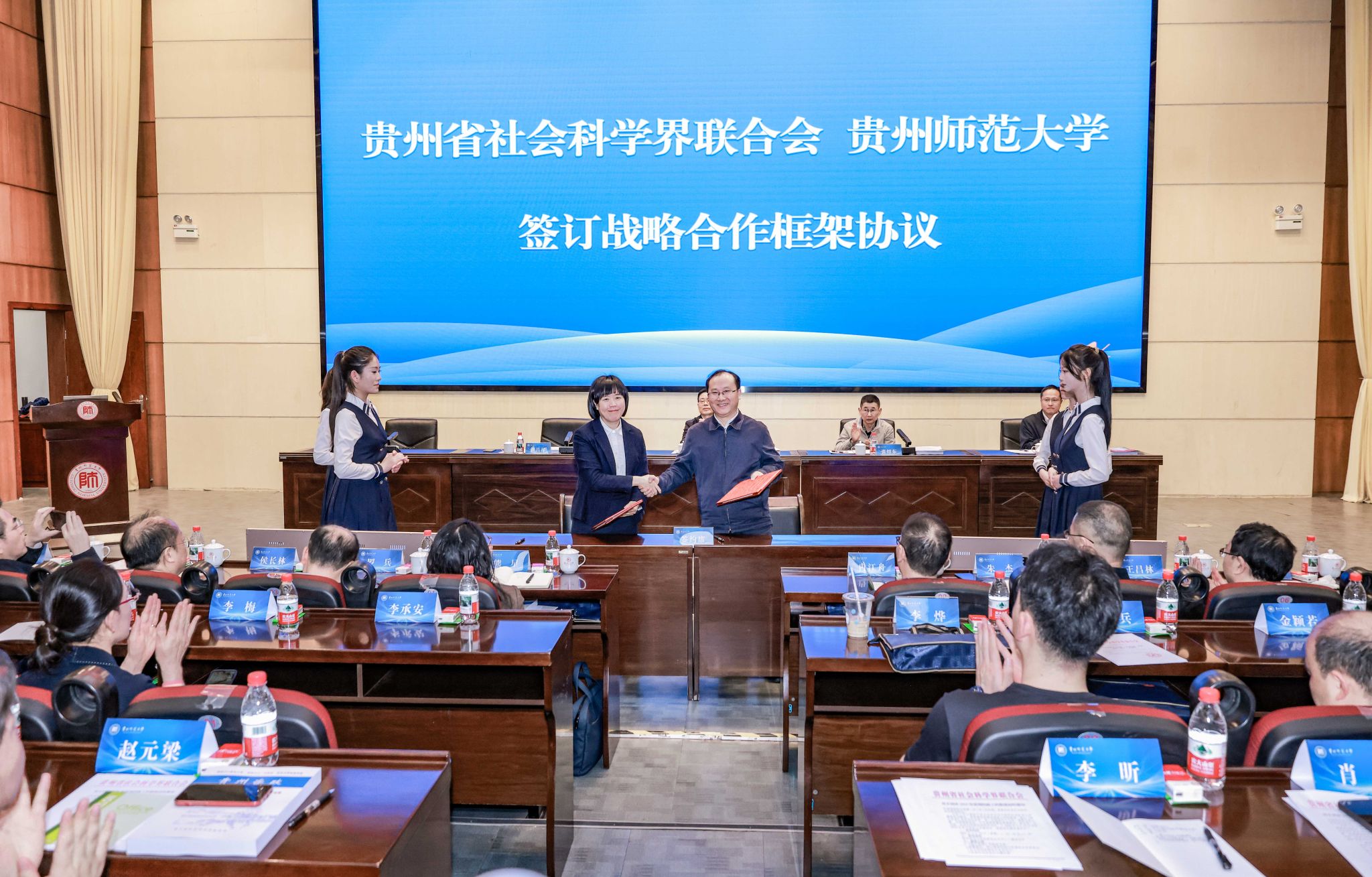 4月20日下午,2026年《贵州咨政》工作推进会在贵州师范大学东区会议中心一楼学术报告厅召开。省社科联党组书记、副主席范省伟讲话,贵州师范大学校长张绍东致辞。省社科联党组成员、副主席黄昌祥与我校副校长刘瑾分别代表两家单位签订战略合作框架协议。省社科联党组成员、秘书长丁凤鸣主持会议。贵州工程应用技术学院党委书记熊星、贵阳康养职业大学党委书记冉江舟等高校领导出席会议。
