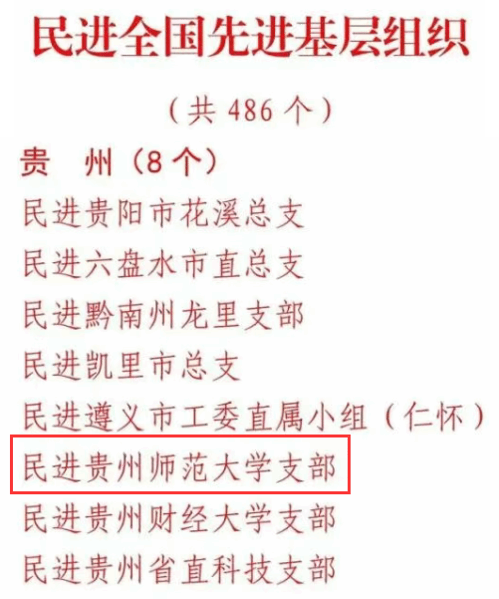 12月9日,在庆祝中国民主促进会成立80周年之际,为表彰先进、树立典型,民进中央授予民进贵州师范大学支部“民进全国先进基层组织”称号。据悉,全国共有486个基层组织获此殊荣。