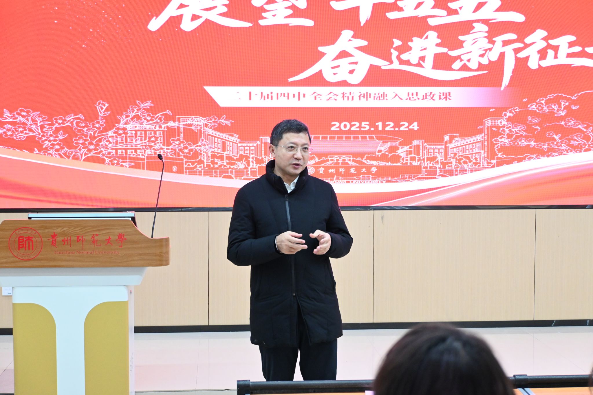 12月24日,贵州师范大学马克思主义学院联合附属高中、贵安新区附属初中、贵安新区附属小学在学校东区GJ4101 教室举行以“展望‘十五五’ 奋进新征程”为主题的大中小学思政课教师集体备课会。备课会围绕“经济建设、政治建设、文化建设、社会建设、生态文明建设”五位一体总体布局,将党的二十届四中全会精神融入大中小学思政课教学。校党委书记黄其松,校党委副书记路言莉,副校长管新福,校党委常委、统战部部长、马克思主义学院党委书记路世传出席。
