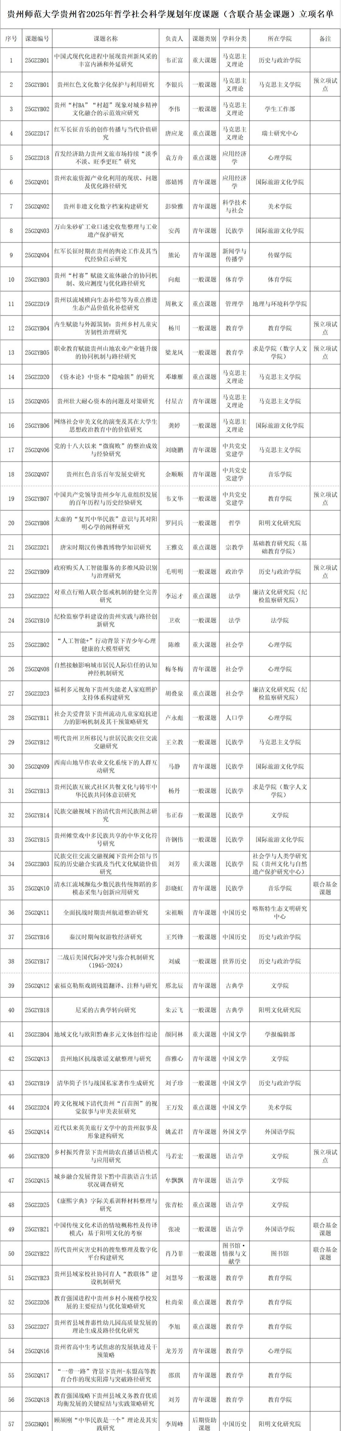 近日,贵州省哲学社会科学规划办公室正式公布贵州省2025年哲学社会科学规划年度课题立项名单,我校共获批57项课题、占全省立项总数的20%以上,创历史最好成绩。其中重大课题4项、重点课题11项、一般课题23项、青年课题18项、后期资助课题1项,立项结构均衡,各层级课题均实现量质齐升。