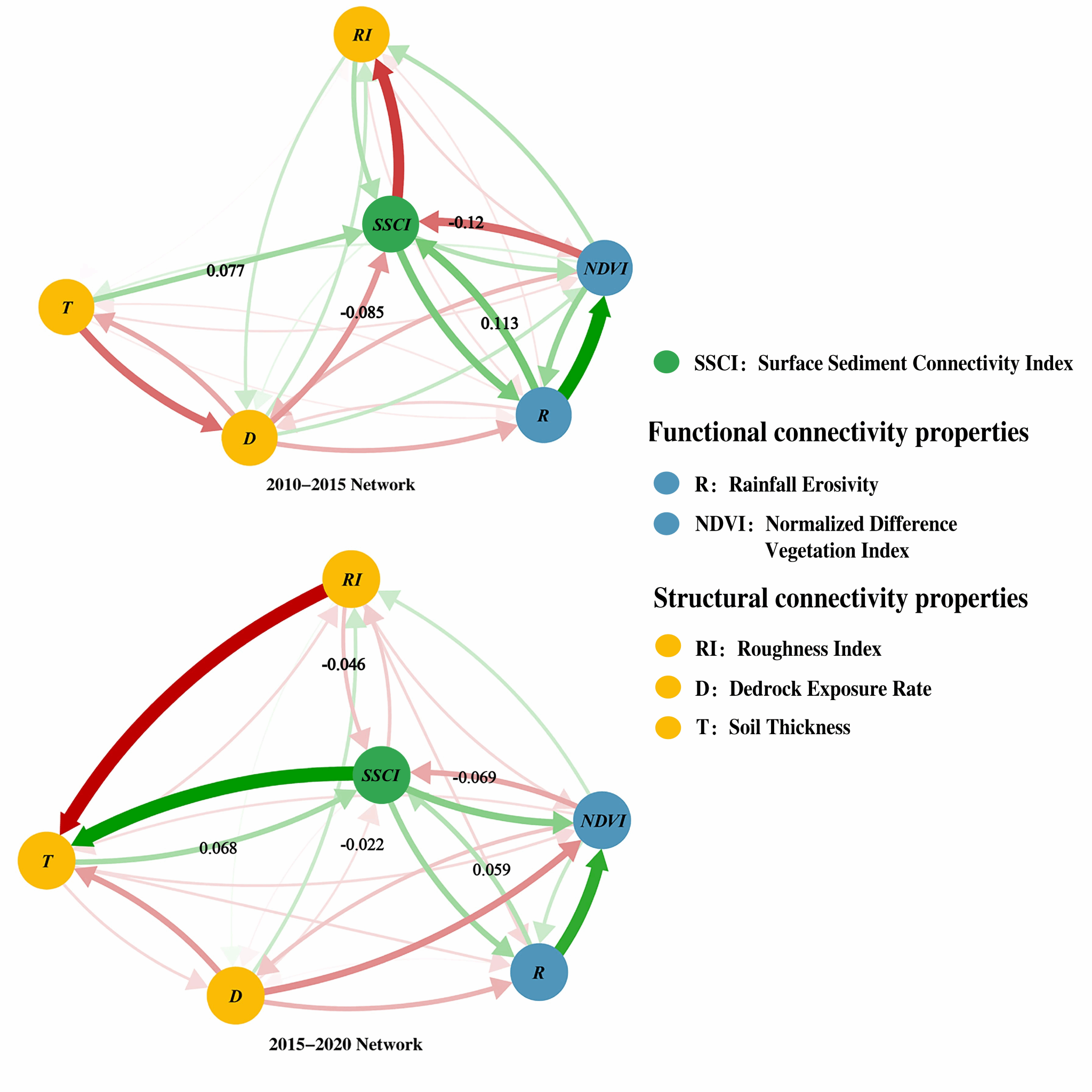 鉴于此,本研究通过综合降雨侵蚀力(R)、植被(NDVI)、裸露岩石(D)、地表粗糙度(RI)及土壤厚度(T)等地表特征因子对IC模型进行了优化和验证,从而发展了一种新的泥沙连通性模型SSCI。研究显示,野纪河流域SSCI呈下降趋势,且流域南北部及出口附近区域SSCI显著较高,成为水土流失防治重点区。交叉滞后面板网络模型解析发现,NDVI、D、R、RI和T均对SSCI均存在稳定的预测关系。预期外影响(Out-EI)和预期内影响(In-EI)进一步解释了各因子之间的预测关系。R是SSCI的最强预测因子(Out-EI=1.080和1.433)。NDVI(IN-EI=1.388)和RI(IN-EI=0.929)是最有可能受R影响的因子。这表明,与其他因子相比,R增强了泥沙输移过程的复杂性,而NDVI和RI更显著地降低了泥沙的可达性。因此,应根据流域NDVI和RI的变化制定早期预防计划和实施干预策略。