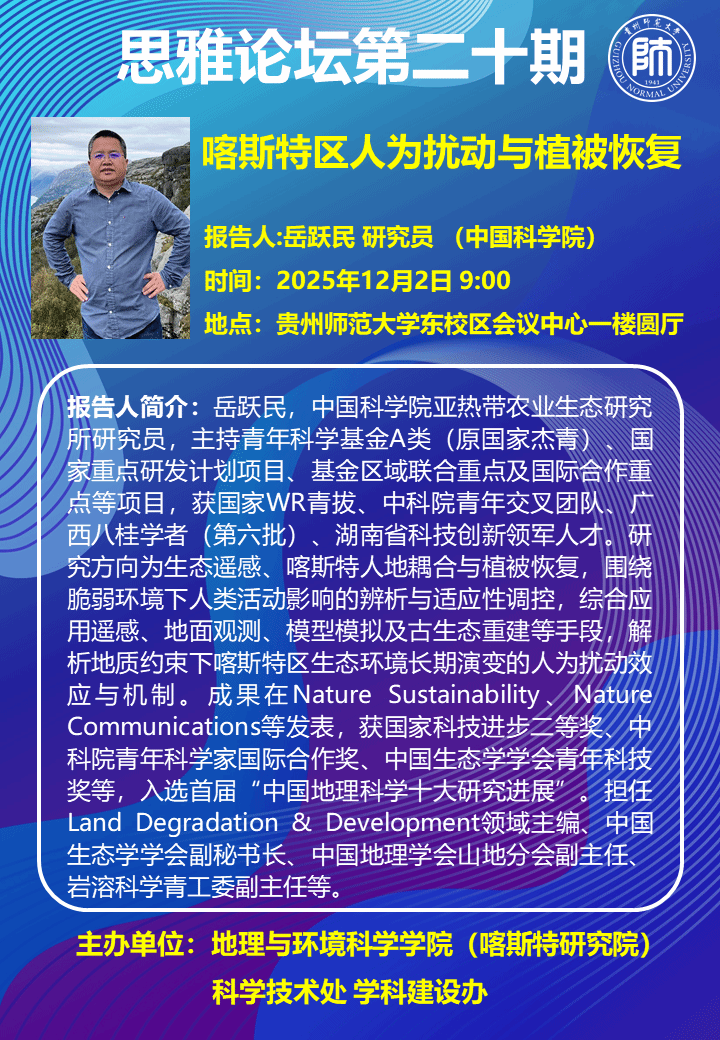 为团结引领我校科技工作者聚焦我省“四区一高地”主定位,围绕“四新”主攻“四化”主战略,助推“六大产业基地”建设工作,营造平等求真的学术环境和交流氛围,发挥学术交流在推动科技创新、带动学科发展、助力人才成长的积极作用,地理与环境科学学院(喀斯特研究院)、科学技术处、学科建设办特邀请中国科学院亚热带农业生态研究所岳跃民研究员作学术报告。活动安排如下: