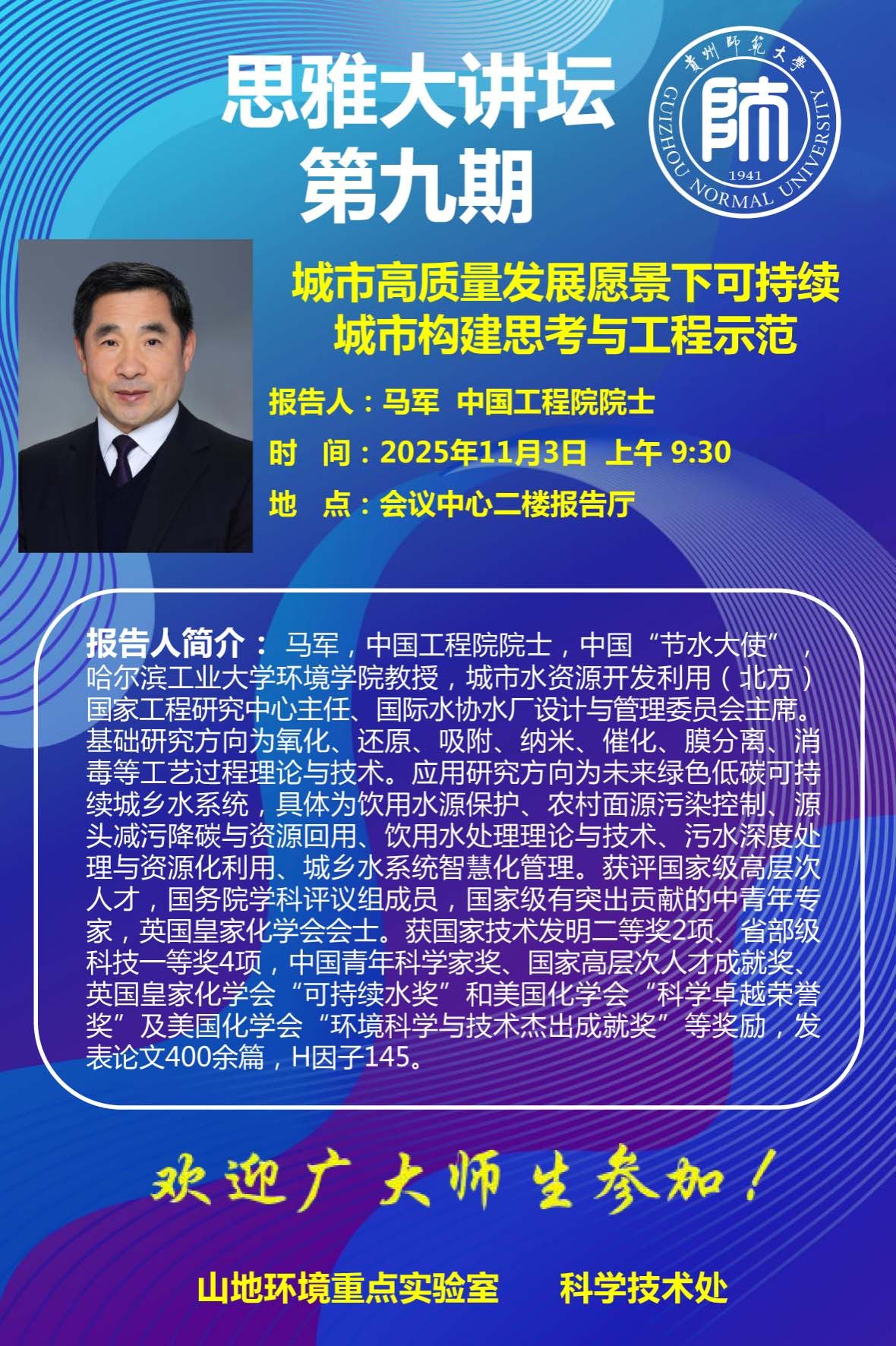为团结引领我校科技工作者聚焦我省“四区一高地”主定位,围绕“四新”主攻“四化”主战略,助推“六大产业基地”建设工作,营造平等求真的学术环境和交流氛围,发挥学术交流在推动科技创新、带动学科发展、助力人才成长的积极作用,山地环境重点实验室、科学技术处特邀请中国工程院院士马军到我校开展专题讲座。现将活动安排通知如下: