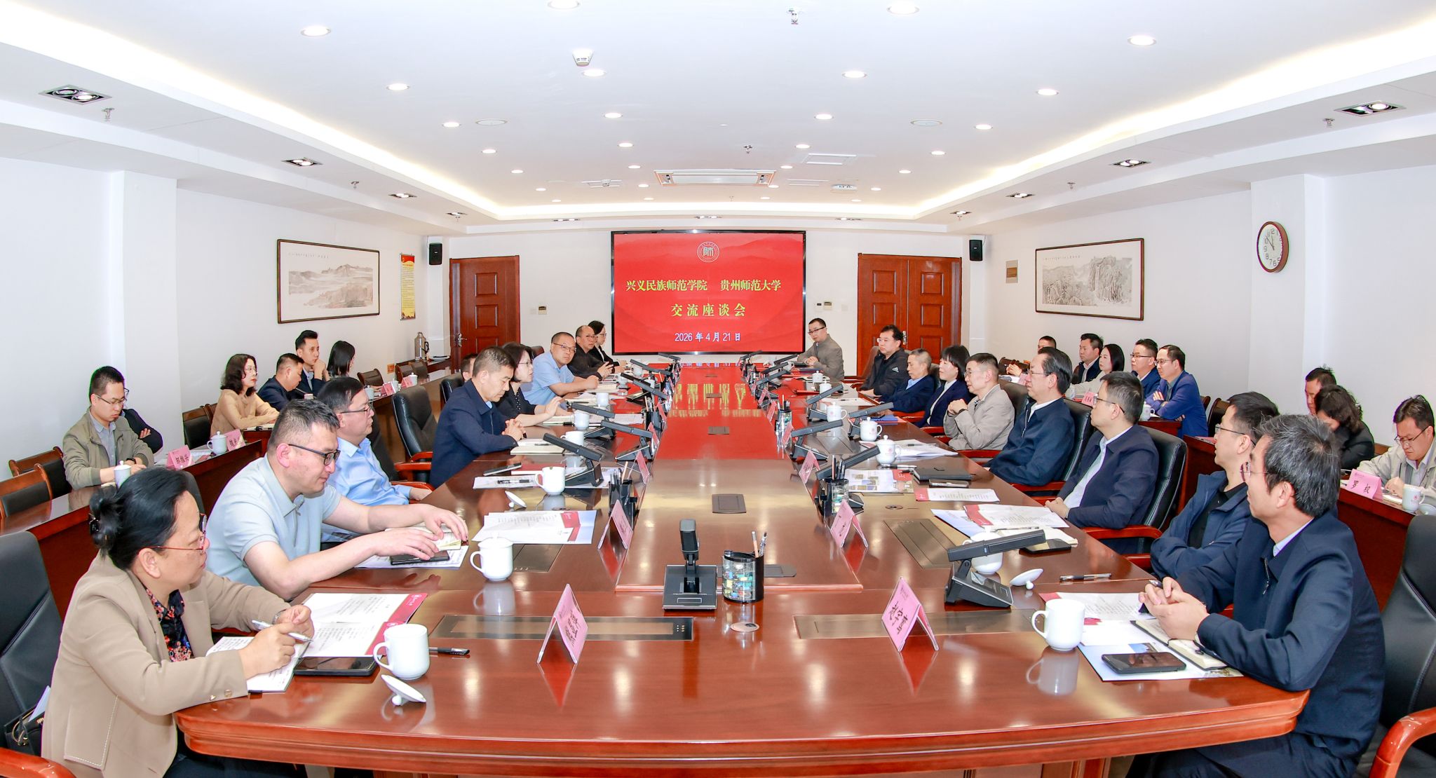 4月21日上午,兴义民族师范学院党委书记丁湘梅,党委副书记、院长张乾飞率队赴我校交流座谈。兴义民族师范学院党委副书记刘志军,副院长薛璞、刘勇、李志刚等随行。座谈会在学校东区行政主楼五楼2会议室举行。我校党委副书记、校长张绍东,副校长刘瑾、冯海涛、吴复忠出席,校党委副书记陈应勇主持座谈会,两校相关职能部门、学院负责人参会。