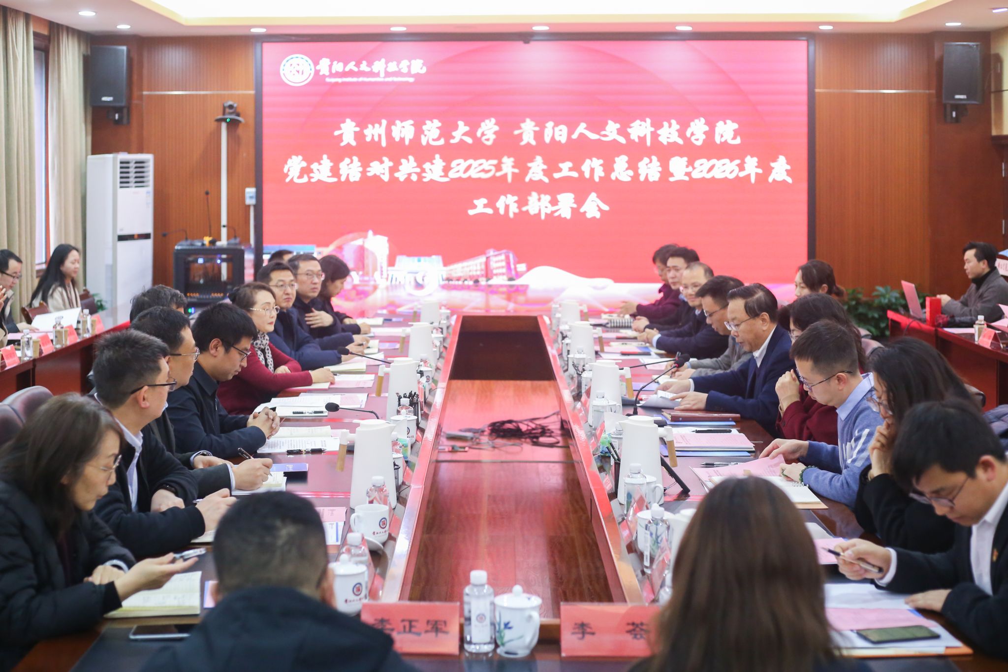1月14日,贵州师范大学与贵阳人文科技学院党建结对共建2025年度工作总结及2026年度工作部署会在贵阳人文科学院召开。贵州师范大学党委书记黄其松,党委副书记路言莉;省教育厅(省委教育工委)民办高校党组织书记(副厅长级);贵阳人文科技学院党委书记刘杰,党委常务副书记陆官虎,党委委员、副校长左丹出席。贵阳人文科技学院校长王凤友主持。两校有关责任单位(部门)负责人参加。