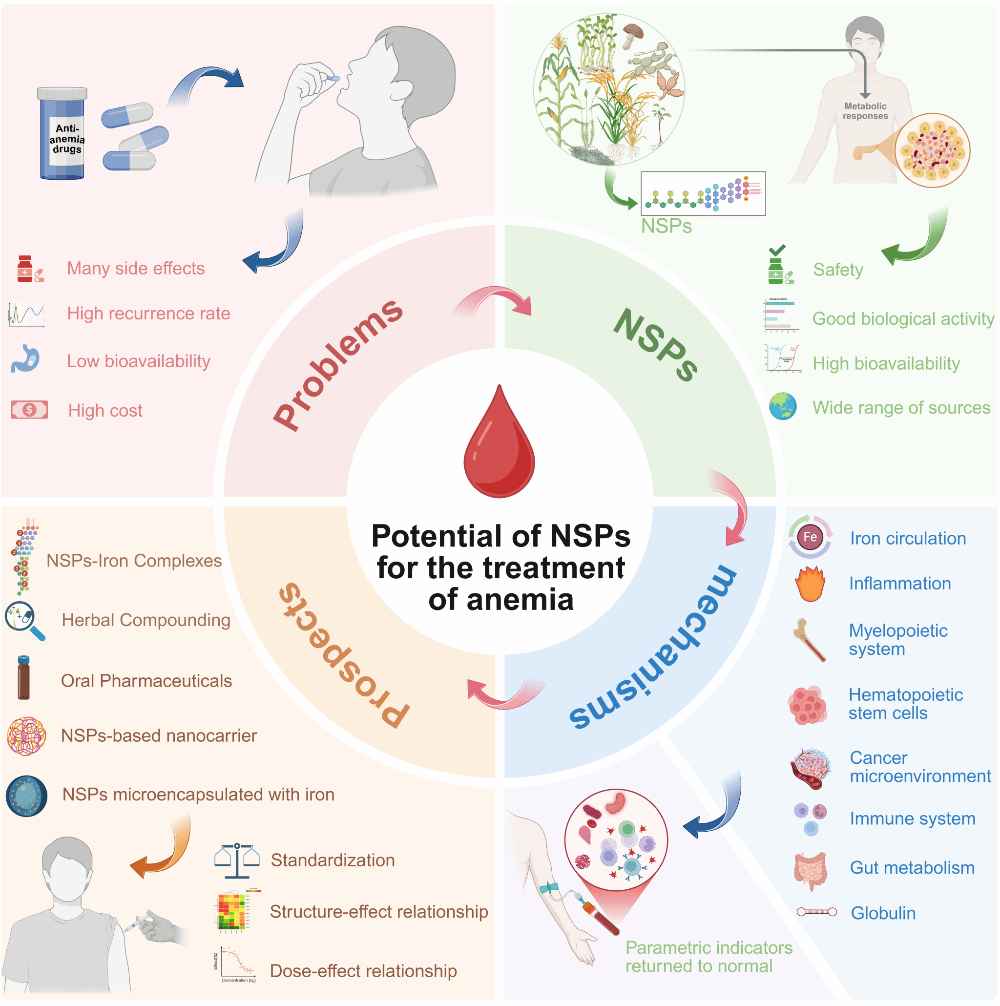 贫血是一种常见的疾病,威胁着人类健康。现有的治疗药物常常伴随着不良反应或生物利用度不足等问题。天然来源多糖(NSPs)因其优越的生物活性、生物相容性和安全性特性,及其在贫血干预中的潜力而受到越来越多的关注。本综述系统阐明了NSPs在治疗缺铁性贫血(IDA)、炎症性贫血(AI)、再生障碍性贫血(AA)、癌症相关贫血(CRA)、出血性贫血(HA)和地中海贫血(Thal)中的药理活性、分子机制及各类贫血特异性通路。同时,本研究分析了临床转化在药物动力学、制剂稳定性、监管障碍、剂量安全性及结构-活性关系方面的前景与局限性,并提出未来的研究方向。本研究为开发基于NSPs的新型抗贫血治疗提供了新颖见解和科学依据。