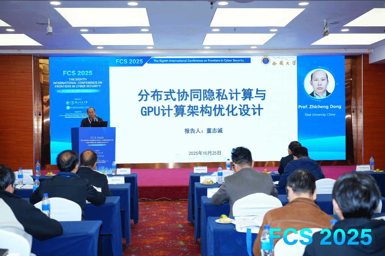 来自多所高校的专家学者作了大会报告,分享了最新研究成果。四川大学陈兴蜀教授阐述了网络空间威胁权威可测数据集的研究成果;华侨大学田晖教授深入探讨了VoIP流中的人工智能驱动隐蔽通信与检测技术;中国科学技术大学张卫明教授聚焦AIGC和AI模型的水印技术研究;清华大学罗平教授分享了基于大模型的公钥密码分析方法;中国科学院大学翟立东教授介绍了面向下一代数字基础设施的主动安全验证平台“TianzhuOS”;西藏大学董志诚教授提出了高原环境下的分布式GPU计算架构优化方案。我校大数据与计算机科学学院网络空间安全学科负责人暨本次大会的技术委员会主席陈延利进行了总结发言。