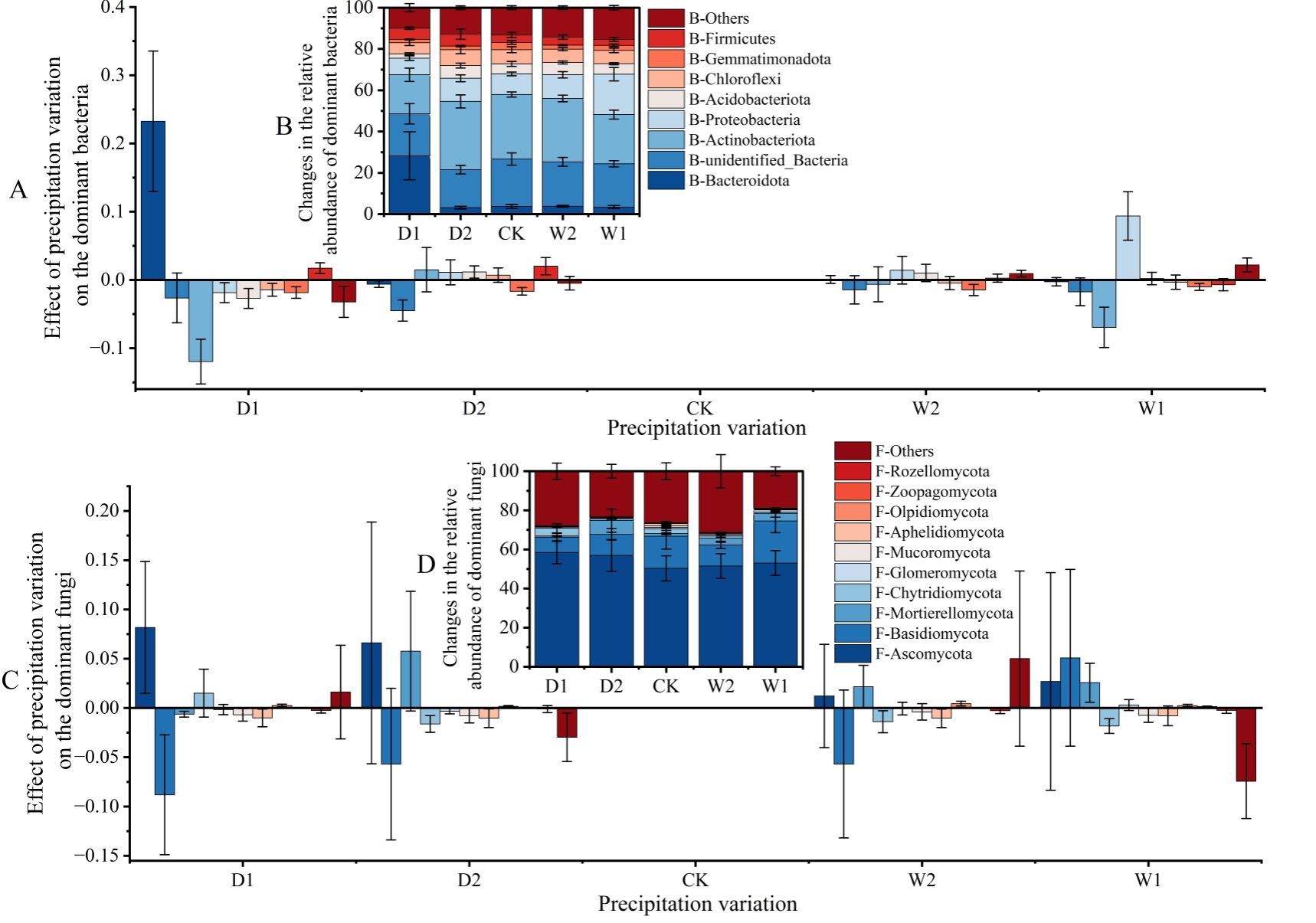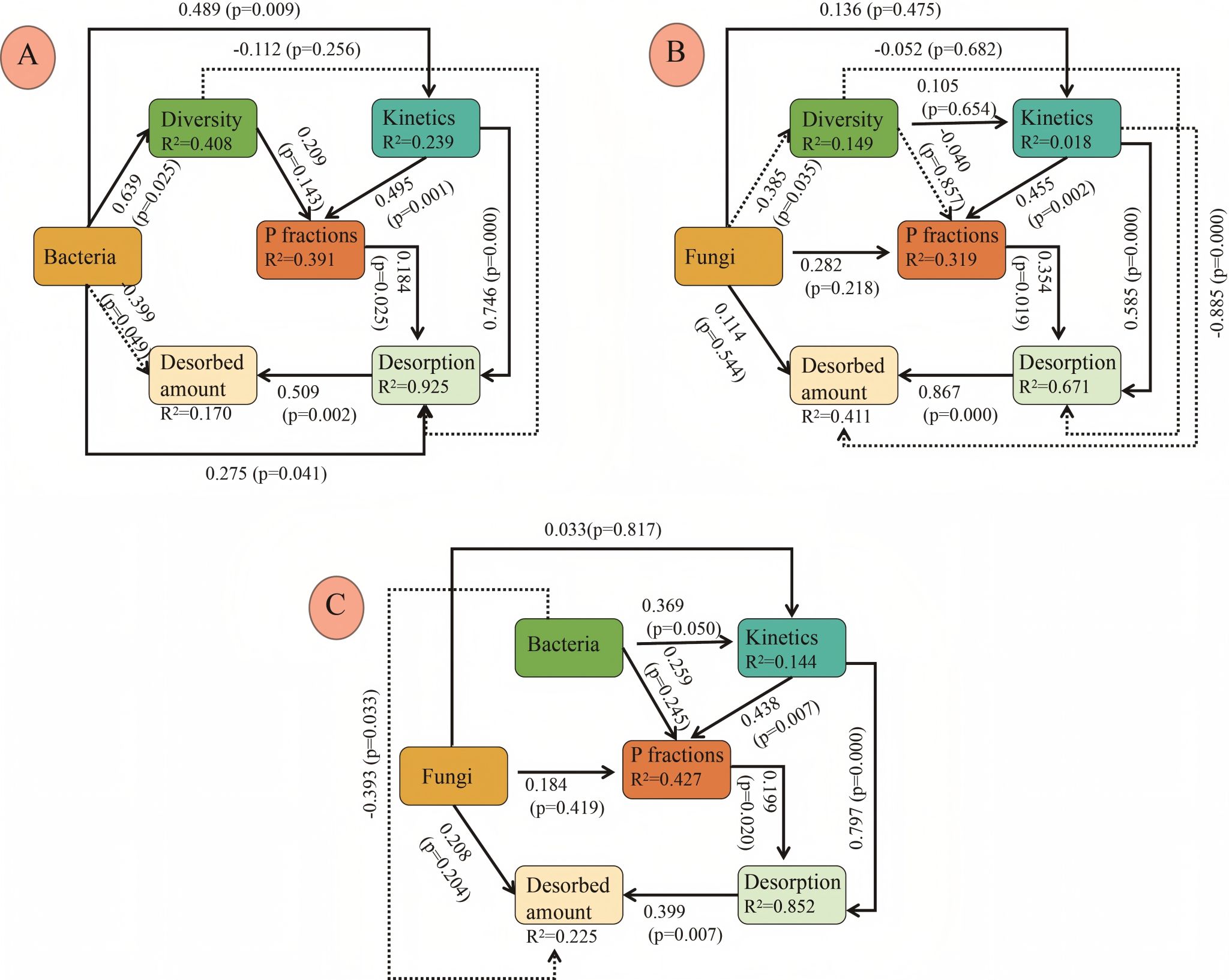 该研究通过两年的野外降水控制试验,结合微生物群落动态,酶动力学过程,磷释放动力学过程,磷组分动态变化,拟揭示微生物介导不同磷组分响应降水变化的机制。该研究表明降水增加提高了细菌多样性,同时降低了真菌多样性和物种数量,减少了土壤磷解吸位点;干旱加剧促进了耐胁迫微生物的丰度,减少了对水分敏感的微生物种类,降低了无机焦磷酸酶活性和最大酶促反应速率。而对磷组分的变化,细菌与真菌共同贡献了49.9%,酶动力学过程贡献了28.8%,磷解吸动力学过程贡献了21.4%。研究发现微生物调节磷组分响应降水的关键途径包括:微生物(主要为细菌)通过加快酶动力学过程、增加磷组分浓度(主要是Po和Olsen-P)、促进磷解吸过程、提高磷解吸量以应对降水变化。